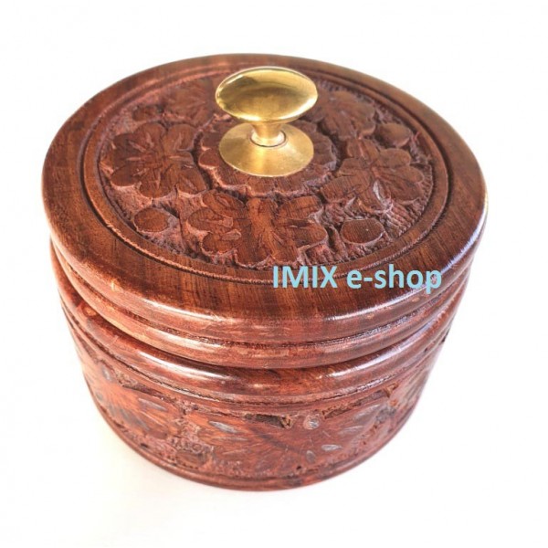 Dřevěná vyřezávaná dóza, šperkovnice kruhová s víkem