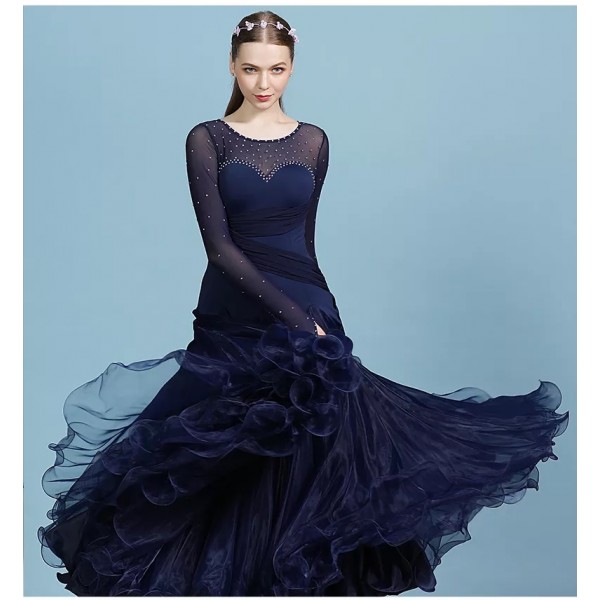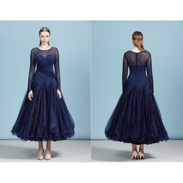 Profesionální dámské taneční šaty zdobené kameny a průhlednou síťovou látkou od dekoltu po rukávy.