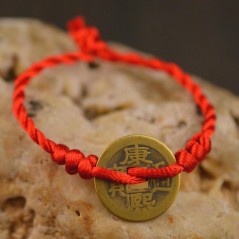 Čínské mince s posvátnými nápisy jako symboly štěstí, bohatství a úspěchu. Tato velká mince navázaná na červený náramek s proplétanými oky je silným energetickým a feng shui pomocníkem.