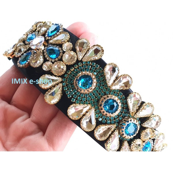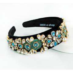 Dobře padne na dámskou (i dívčí) hlavu. Je pružná, má změkčené textilní zakončení a celá spodní část je podlepená imitací kůže v tělové přírodní barvě. Velké kameny různých tvarů jsou dozdobeny dokola štrasovými drobnými skleněnými broušenými kameníky - viz. fotografie.