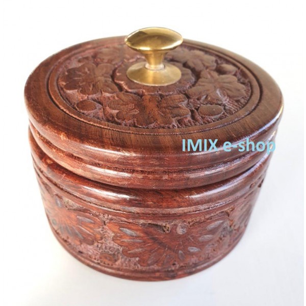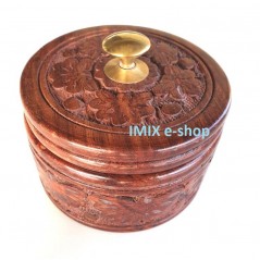 Dřevěná vyřezávaná dóza, šperkovnice kruhová s víkem