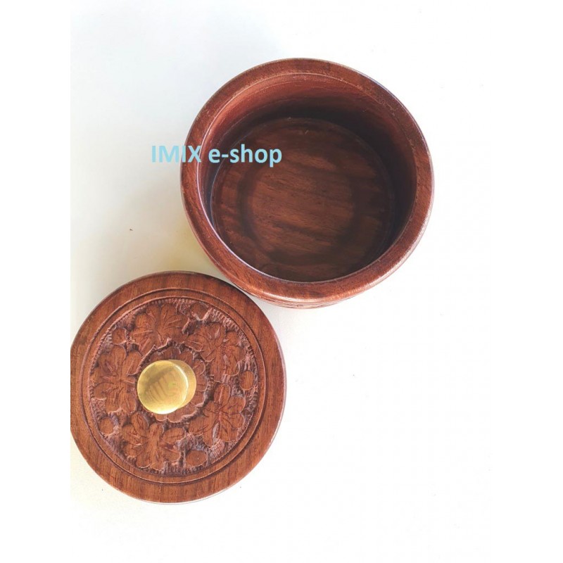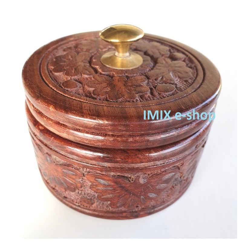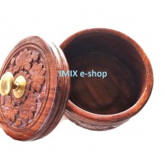 Beautiful carved jewelry box made of tropical wood with a metal handle. Closing cap. Also ideal as a gift with money for newlyweds, for example, or filled with semi-precious stones, coins, jewelry, etc. A practical box that will find many uses.