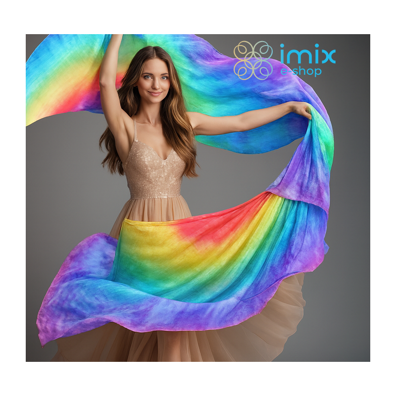 Luxurious semicircular silk veil made of genuine 8 mm habotai, hand batiked in rich rainbow colours. Size 270 × 110 cm, hand curled edges. Lightweight, perfectly flowing and ideal for professional dancing.