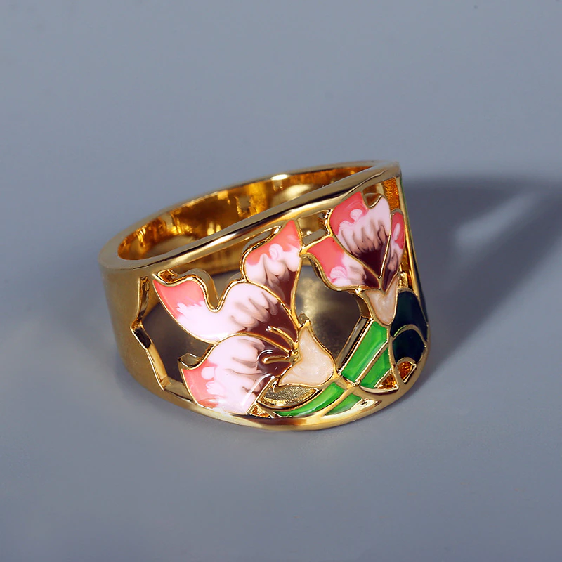 Large chunky ladies ring with transparencies around beautifully coloured flowers.