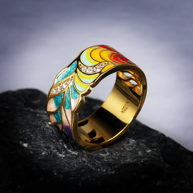 copy of Luxury gold massive ring with painted flowers and cubic zirconia
