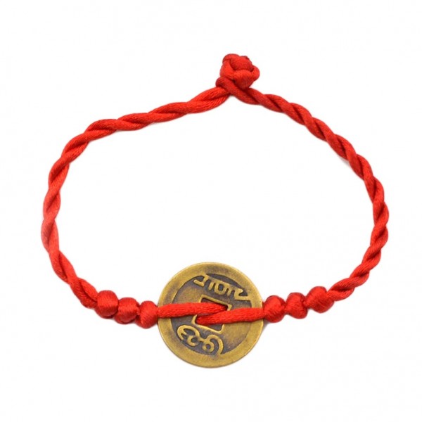 Čínske mince s posvätnými nápismi ako symboly šťastia, bohatstva a úspechu. Táto veľká minca naviazaná na červený náramok s prepletanými okami je silným energetickým a feng shui pomocníkom.