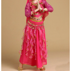 Orientálny kostým pre dievčatá, malé aj veľké brušné tanečnice. Súčasťou tohto kostýmu je tiež dlhý závoj, ktorý je možné používať ako klasický závoj pri tanci alebo ho možno zapnúť k ozdobenej čelenke (ktorá je tiež súčasťou tohto setu) a mať ho ako splývavý závoj cez vlasy.